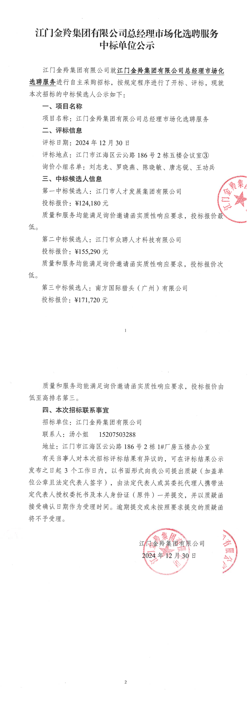 江门金羚集团有限公司总经理市场化选聘服务中标单位公示