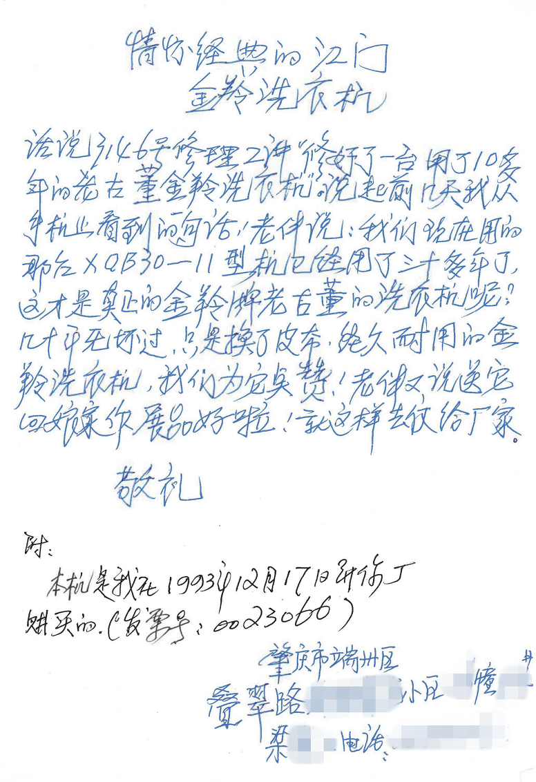 金羚洗衣机“长寿”传奇:32年无故障运行,八旬老人致信感恩“娘家”