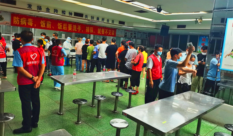 疫情就是命令,防控就是责任。在收到新中社区的核酸检测通知后,金羚集团第一时间响应,动员党员当先锋作表率,积极投身疫情防控工作,切实为群众办实事。领导班子更是闻令而动、冲锋在前,“我是党员,我先上”,党员干部纷纷踊跃报名参加,短时间内就集结了几支党员队伍从早上8点到晚上11点,支援新中社区和厂内核酸检测点。党员义工在检测现场协助社区义工登记信息、帮助市民扫码登记、维护现场秩序,疏导人群指引排队,切实保障核酸检测工作顺利、有序进行。
